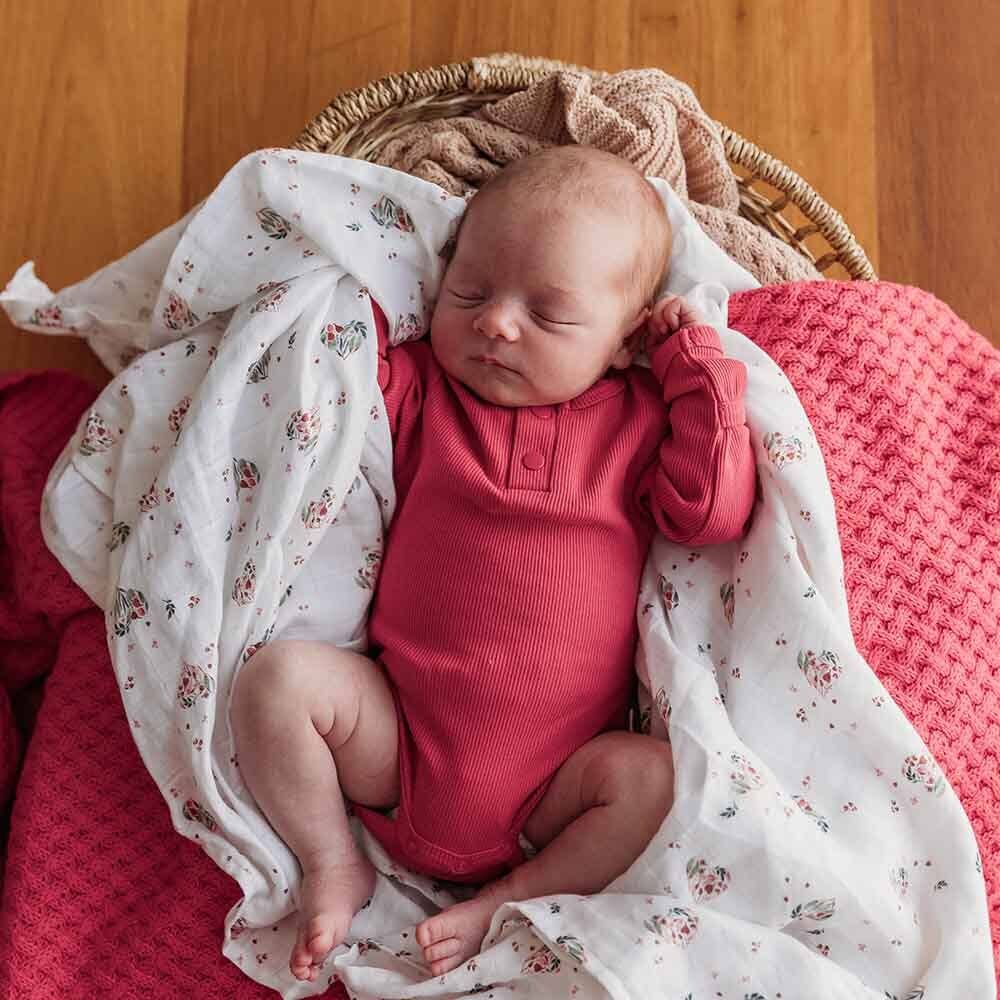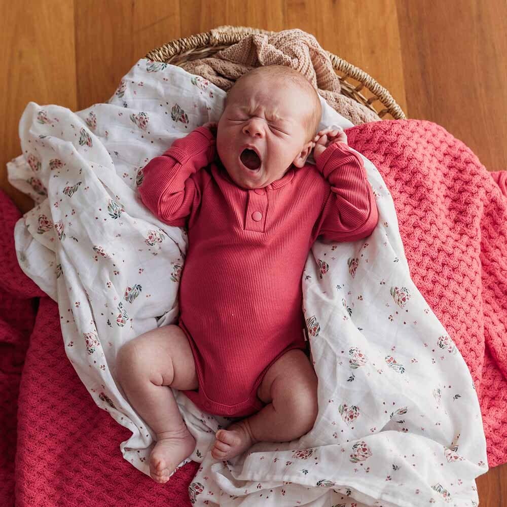 Our Hibiscus organic cotton bodysuit is soft and very snuggly. This is a beautiful colour that works for girls and boys. Snuggle Hunny organic bodysuits are made for babies and toddlers and this bodysuit is long-sleeved, perfect for cooler Summer days, and under layers in Winter. Soft and stretchy, they are easy-care and coordinate well with our pants and shorts. Our bodysuits are also really comfortable to sleep in. All Snuggle Hunny clothing is made with Certified Organic Cotton.