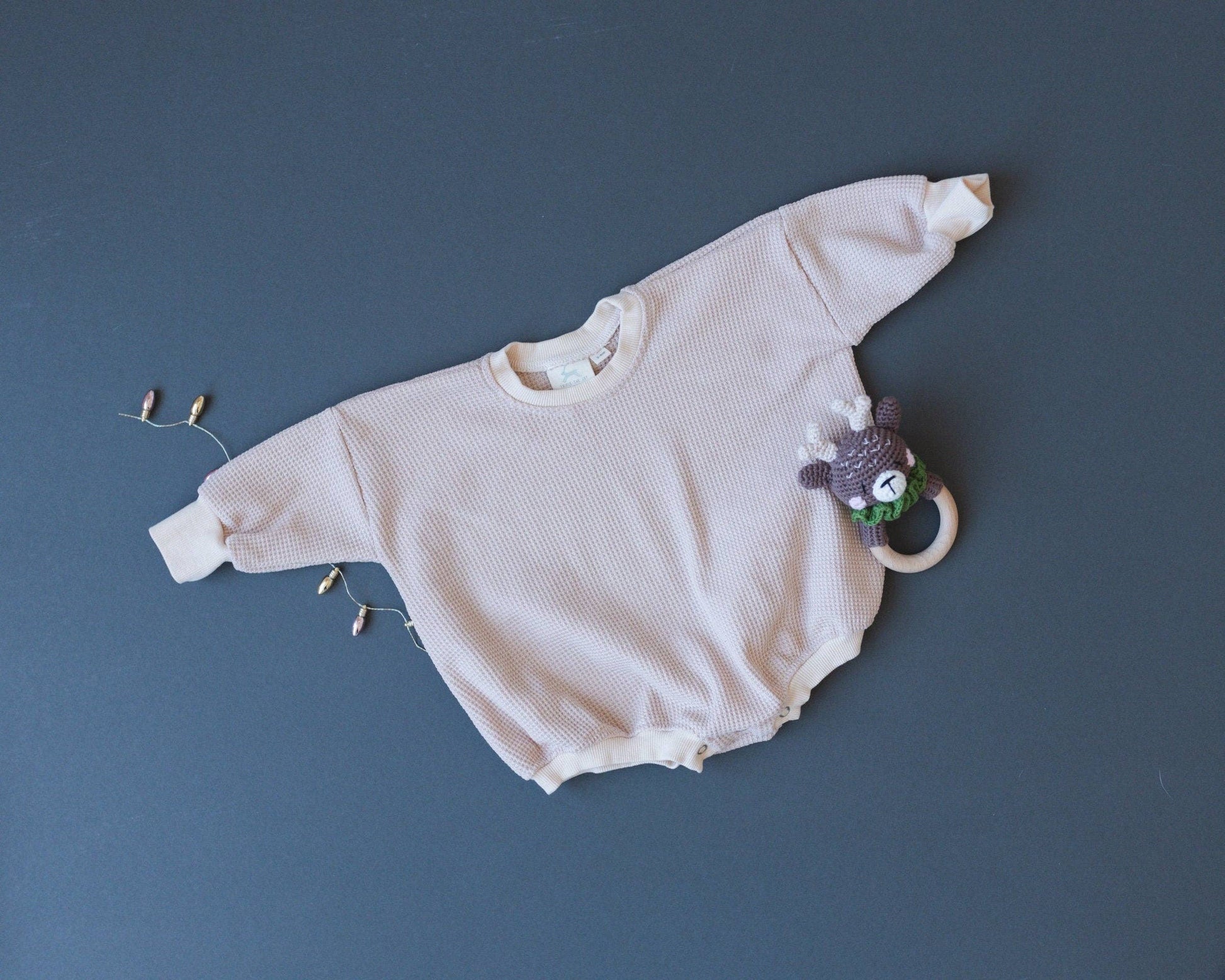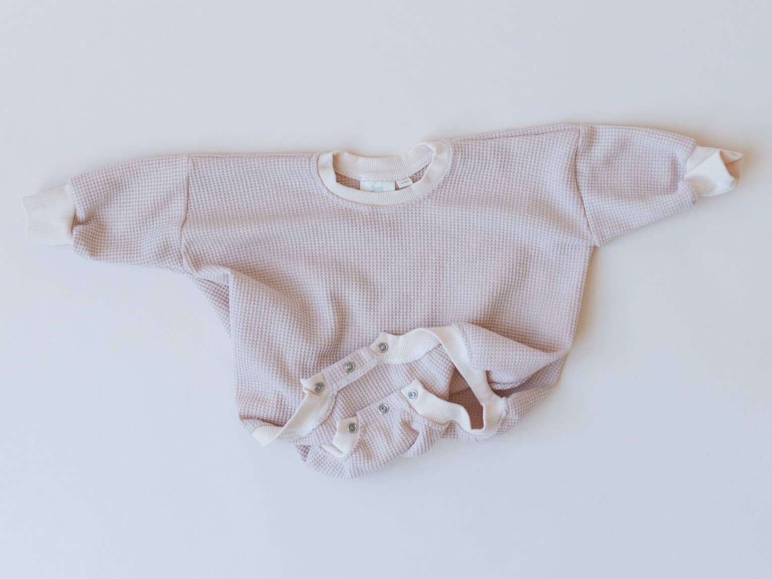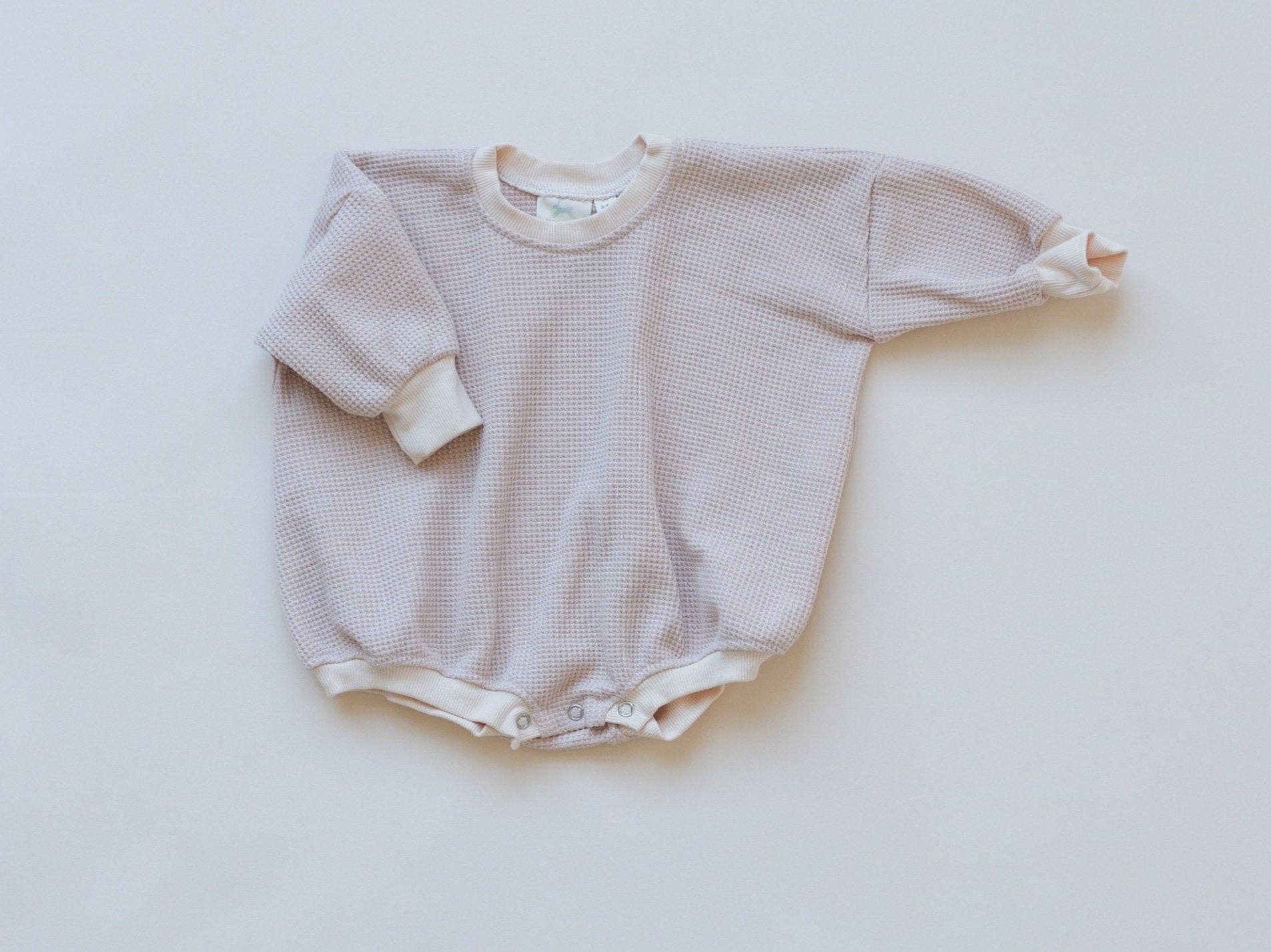Oversized waffle-knit bubble romper with snaps at crotch.